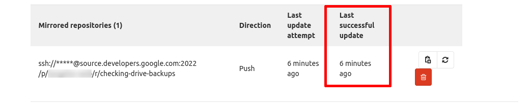 Al subir el código a Gitlab, lo primero que veríamos es cómo el proceso de mirroring se ha ejecutado, enviando el código de Gitlab a los Cloud Source Repositories.